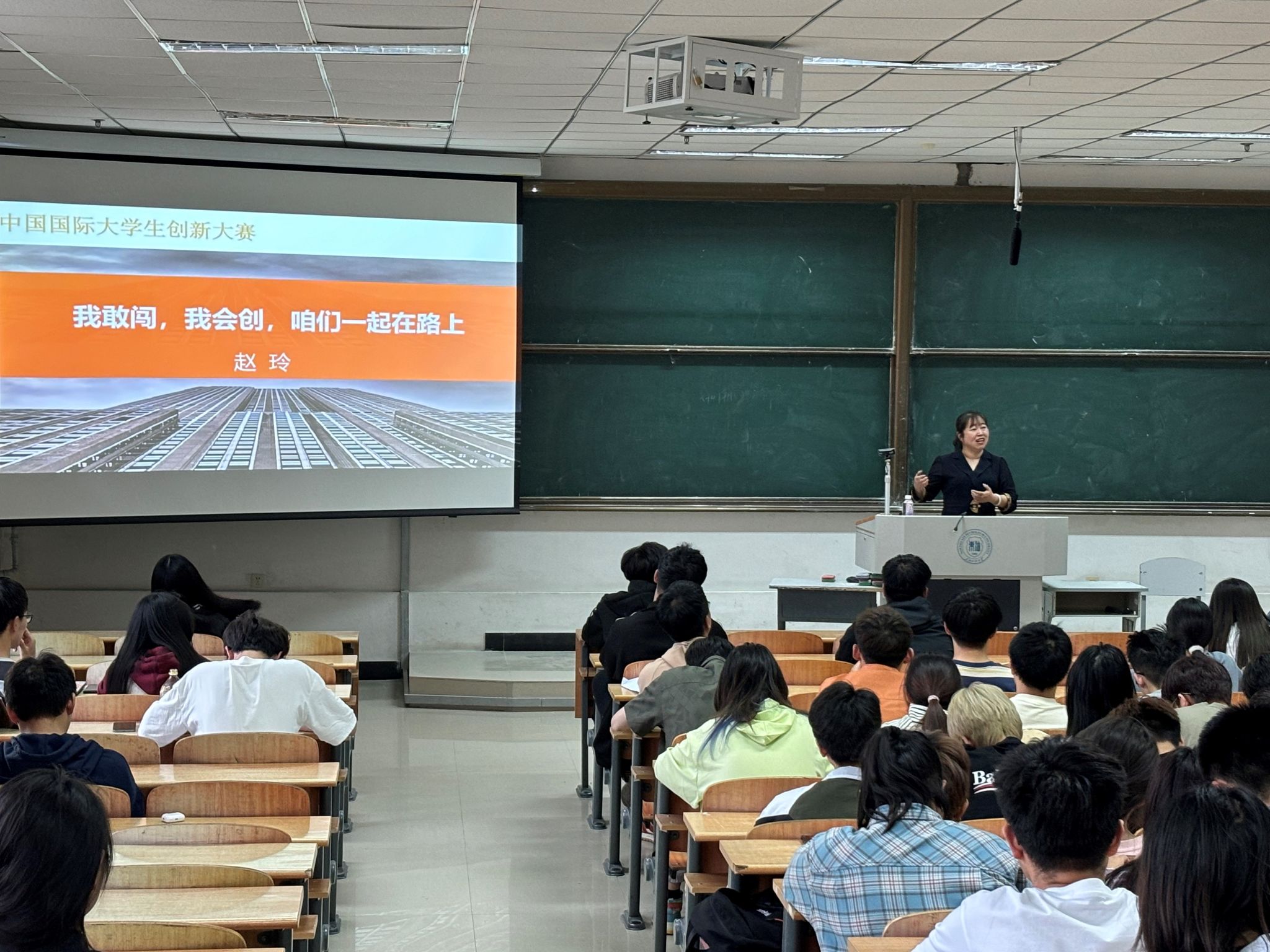其次,赵玲从老员工创新大赛的背景、比赛形式、计划书撰写规范、项目遴选范围、备赛关键要点等方面,给各参赛团队进行了细致的经验交流分享。向同学们讲解了老员工创新大赛的背景及备赛赛道组别的选择规则。结合自身经历,针对在答辩时如何体现团队情况与项目创新性、商业性和应用前景等问题提出了自己的建议。最后,她鼓励同学们在备赛过程中不要畏惧困难,要有乘风破浪的勇气以及信心,在竞赛中磨砺个人意志。分享结束后,赵玲与现场同学进行交流。
