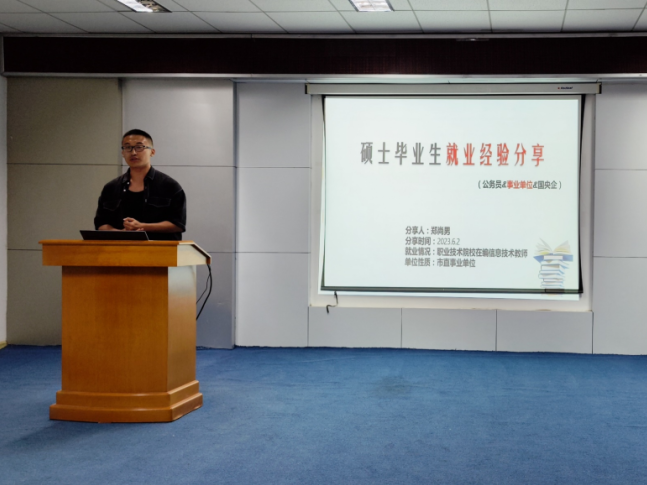 立志从事国家、地方公务工作的软件工程专业毕业生史开援和教育技术学专业毕业生郑尚男,在会上分别分享了国考上岸经验以及考取事业编的经验。