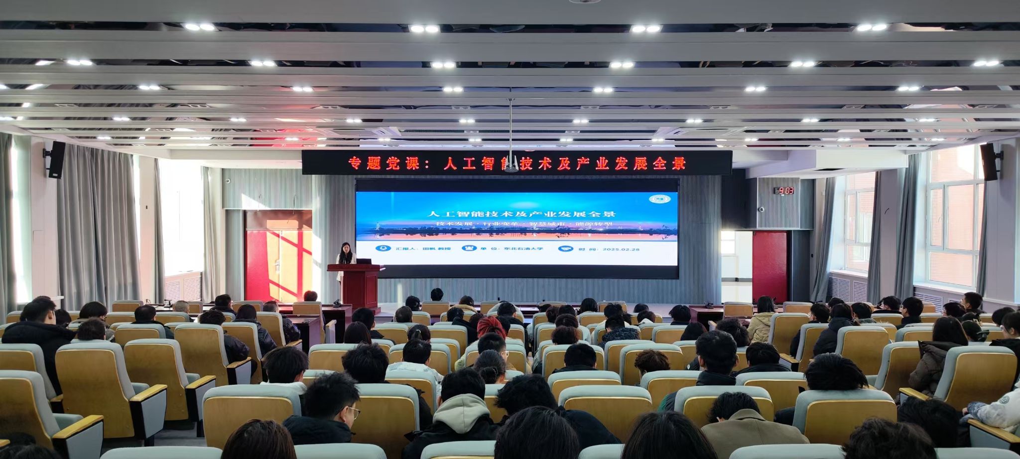 田枫授以“理论+案例”模式,系统解读人工智能技术赋能城市高质量发展的核心逻辑。从人工智能核心技术突破与未来趋势切入,深入剖析全球及中国人工智能产业全景,探讨AI赋能产业升级的实践路径。同时,他还结合大庆本地产业特色,通过石油石化领域智能化应用案例,生动展示了AI技术在产业优化中的实际效能,兼具理论高度与实践指导价值。随后,田枫教授团队成员韩卓翰作《Deepseek使用与智能化办公》专题分享。围绕Deepseek平台的技术特性、使用渠道及智能写作功能展开讲解,通过现场演示展现该工具在教学科研不同场景中的实际应用,为师生提供便捷的AI辅助教学可行性方案。