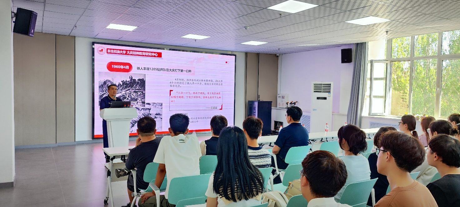 随后,王永航主任以“铁人精神及其时代价值”为题向新生作了主题报告。王主任借助珍贵的历史影像资料和他对铁人精神、大庆精神的深入研究成果,向新生生动讲述了铁人王进喜一生的感人事迹,深入解读了以“爱国、创业、求实、奉献”为核心内涵的大庆精神和铁人精神,并带领新生回顾了公司自1960年创校以来的辉煌发展历程和办学特色。王主任勉励新生要恪守东油校训,传承东油精神,担当时代重任,做新时代合格的研究生。