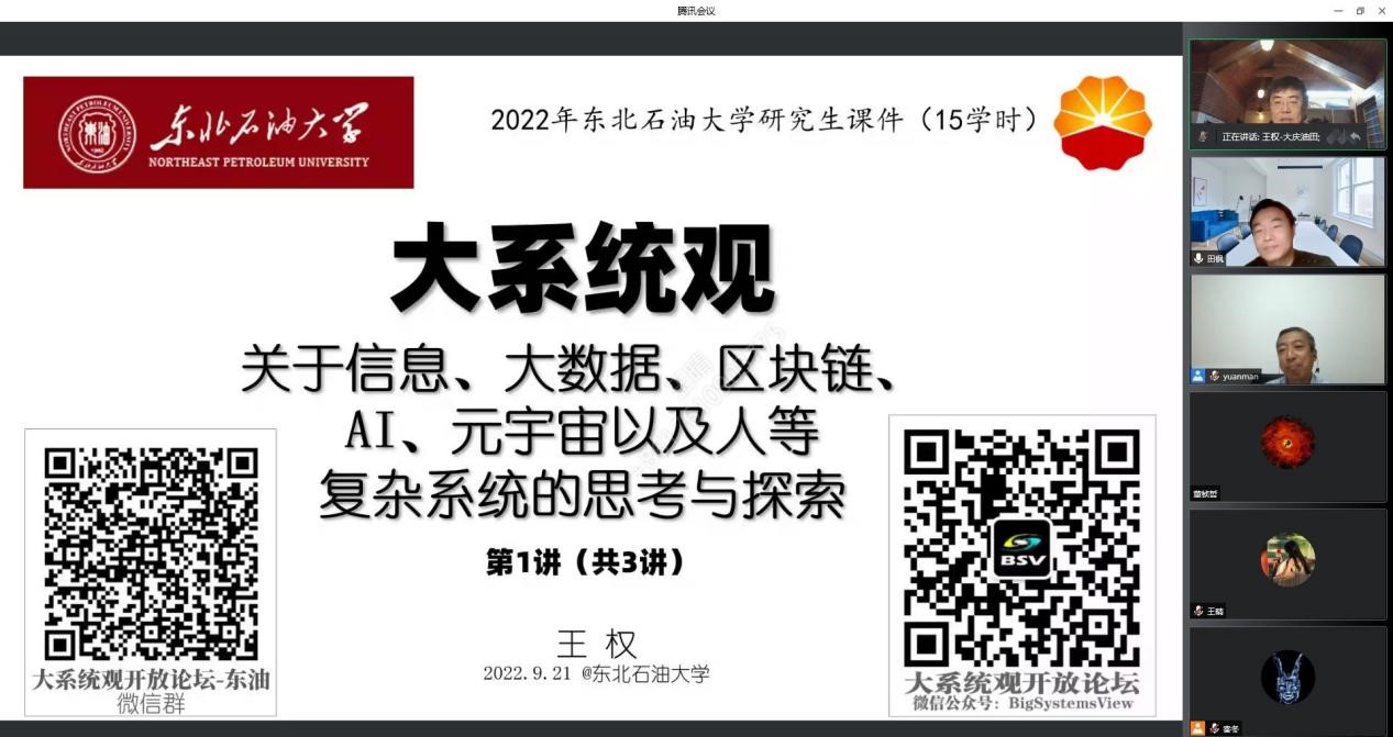 2022年9月21日,应u8国际平台邀请,大庆油田信息技术专家教授级高级工程师王权为公司师生做了《大系统观:关于信息、大数据、区块链、AI、元宇宙以及人与社会等复杂系统的哲学探索》的专题讲座。计算机与信息公司经理田枫做了致辞,全院骨干教师和相关院系教师及2022级u8国际平台全体硕士研究生200余多参加本次学术讲座。