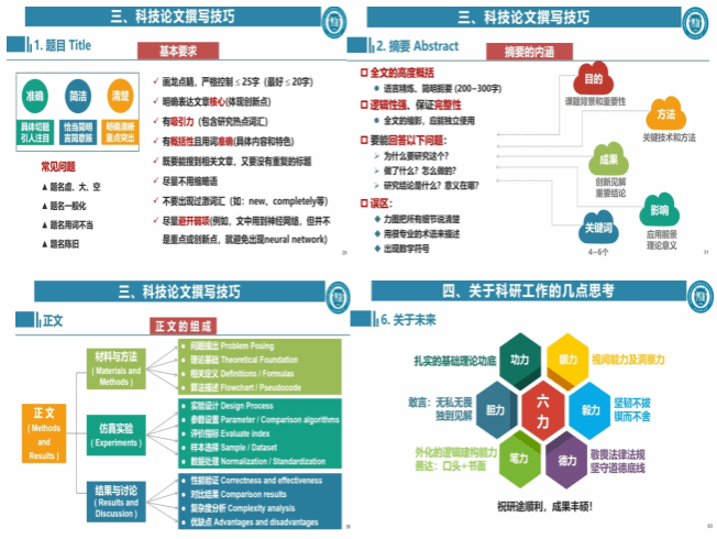 在报告中,刘苗苗老师紧密围绕科技论文的写作技巧展开了讲解。按照题目、摘要、引言、方法、实验、结果、讨论、结论、参考文献的顺序,详细介绍了科技论文结构中每个环节的基本要求、写作要点、误区以及注意事项等,并从图表美化、公式符号规范性、投稿细节等方面详细阐述了相应的写作技巧。报告最后还分享了关于科研工作的几点思考,包括科研工作的五大要素、“入门-选题-坚持-出成果”四个阶段、从角色及思维转换开始的“模仿学习”,以及做好科研工作需要把握的十个要点和科研人应具备的“六力”。
