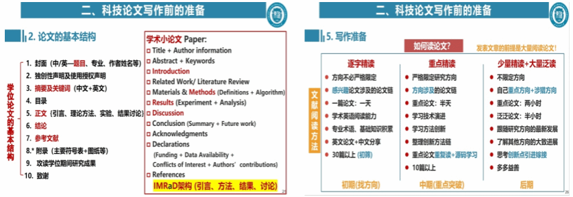 论文写作是研究生素质培养的重要环节,也是科研工作者进行信息交流与知识传播必备的基本功。此次报告以IMRAD(Introduction、Methods、Results、Discussion)架构为主线,详细介绍了论文写作前的准备、科技论文撰写技巧以及关于科研工作的几点思考。报告中指出,撰写论文前的准备工作非常重要,包括了解科技论文的基本结构、弄清论文的评审标准、掌握基本的写作流程等,以及基于“二八定律”的阅读方法、“A+B+C/2.5”法则的创新点提炼,以及早-中-后期“大量泛读+少量精读”的文献积累过程等。