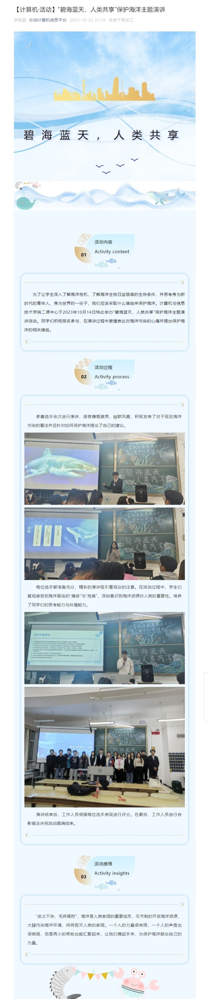 【计算机·活动】“碧海蓝天,人类共享”保护海洋主题演讲