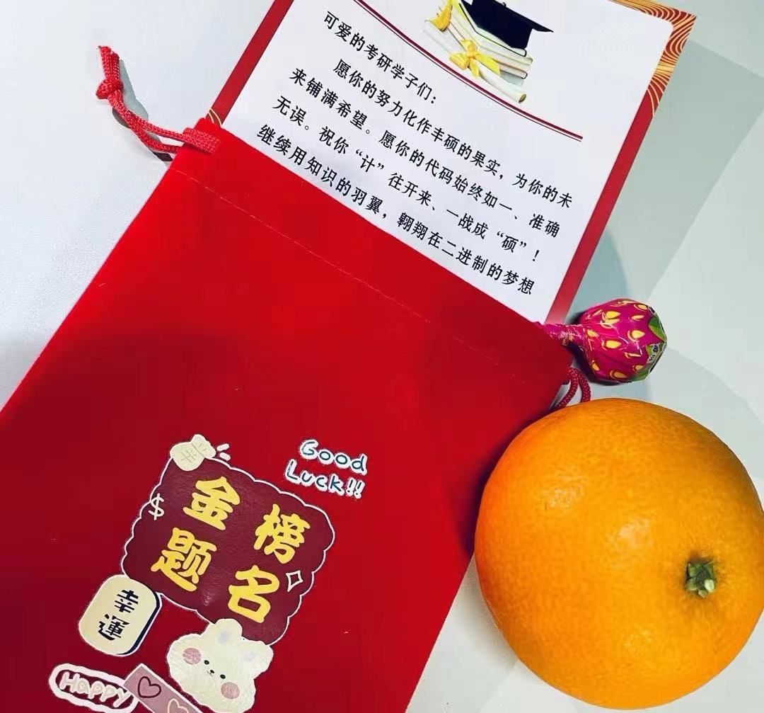 考研礼包中每一份礼物都代表了一份期待,寄托着公司对考研员工的关心与祝福;一颗硕大饱满的橙子,祝愿考研员工心想事“橙”;一个甜甜的棒棒糖祝愿考研员工取得优异成绩,金榜题名;一张明信片,寄托着全院教师的共同祝福,愿考研学子能够“计”往开来,一战成“硕”。