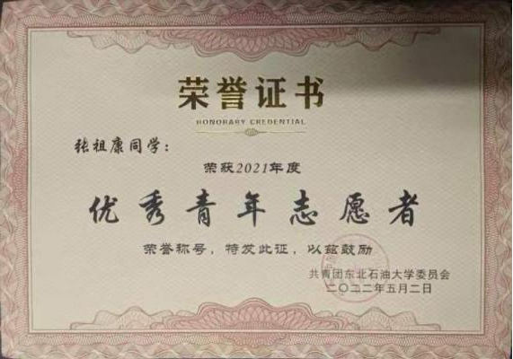 张祖康活跃于员工组织,深受大庆精神、红色基因的影响,始终以全心全意为人民服务作为生活准则。在校期间,帮助同学排忧解难,多次为同学做思想教育工作,为有参军意向的同学了解政策,讲述军旅生活中的一些故事,使他们更加坚信理想信念,扎根铸魂,报效祖国。