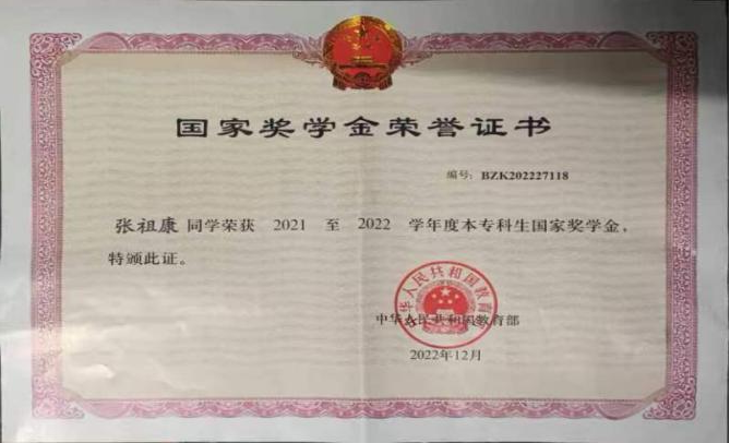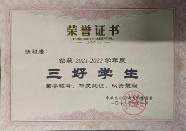 榜样在心中——“知不足而奋进,望山远而前行”2022-2023学年中石油奖学金获得者"张祖康"。